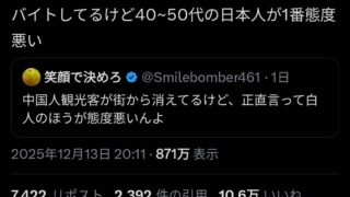 嫌儲X民「バイトしてるけど中国人なんかより中年の日本人が一番態度悪い」