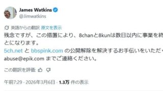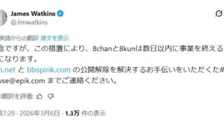 嫌儲ジム・ワキトンス「5chはたった1日で復帰した。今後もユーザーのために素早い対応を準備できる。心配しないでほしい」