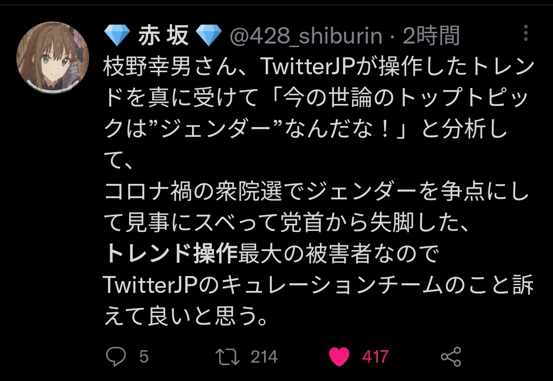 枝野幸男さん、TwitterJPが操作した『ジェンダー』トレンドを真に受けた結果失脚してしまうwwwwwwwwwwwwwwwwww