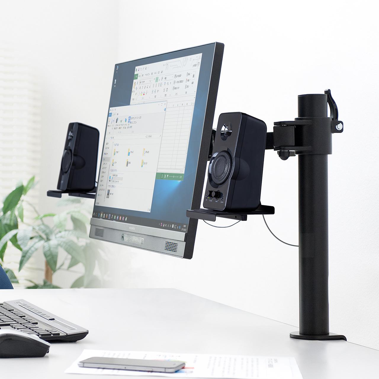 サンワサプライの「VESA取り付け スピーカースタンド 100-VESA008」があれば、そのデスクの上に鎮座するスピーカーたちを、宙(そら)へと打ち上げることができます。