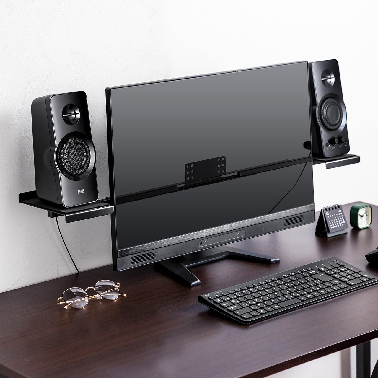 スピーカーをディスプレイの横に浮かせて置ける「VESA取り付け スピーカースタンド」がサンワサプライから発売