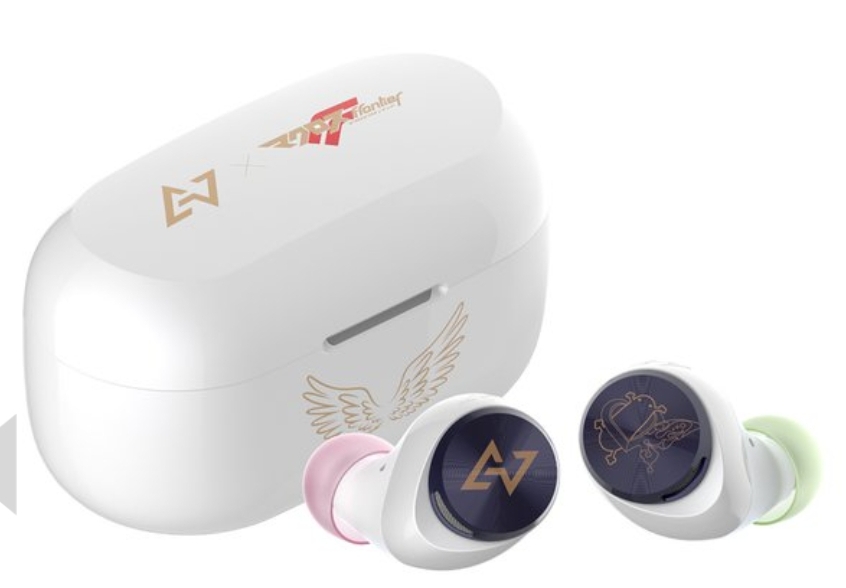 イヤホン本体と充電ケースには、主人公の早乙女アルトの愛機「VF-25F」をイメージした白をメインカラーに据えてデザイン。イヤホン本体にはシェリルとランカの二人のマークを掛け合わせたロゴを配し、充電ケースには作品のキーワードでもある“翼”のイメージをあしらっている。