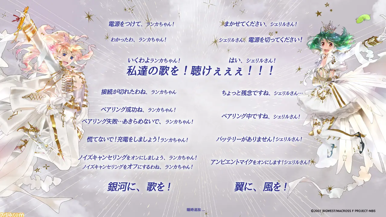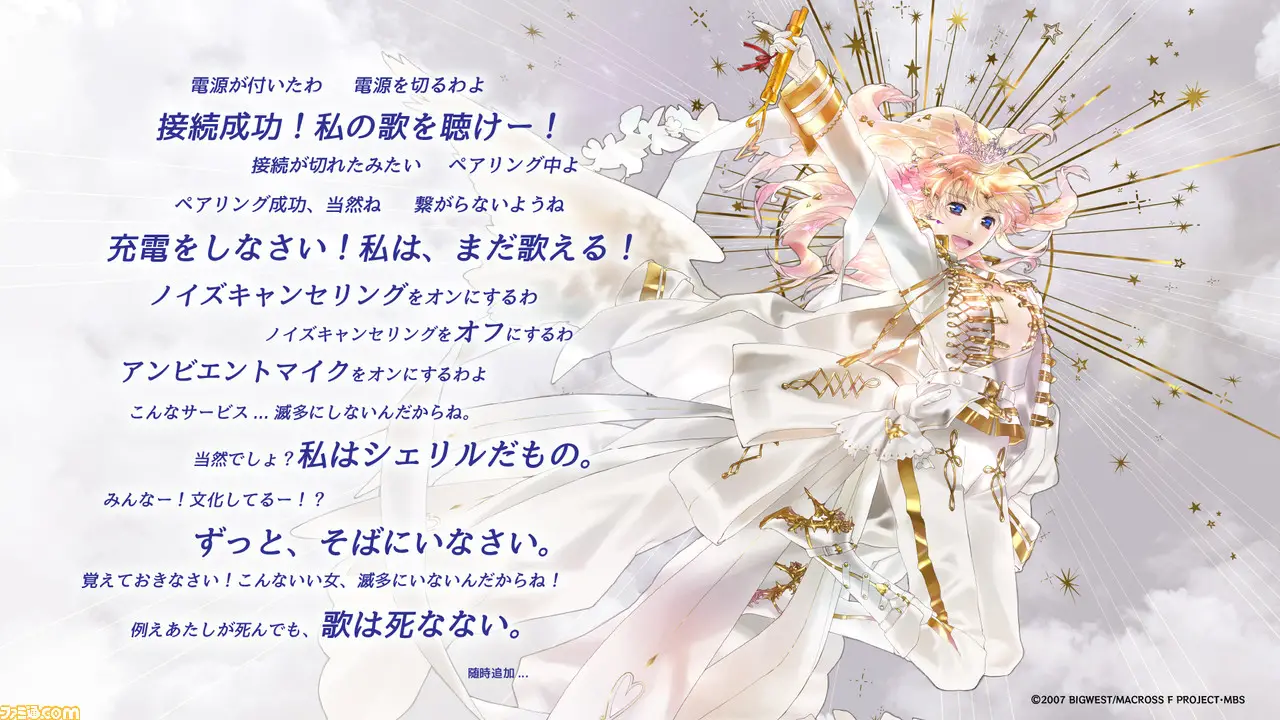 さらに『マクロスF』の登場人物であるシェリル・ノームとランカ・リーの完全新規ボイスを多数収録。ボイスモードとして“シェリルモード”、“ランカモード”に加え、ふたりによる掛け合いを楽しめる“ダブル歌姫モード”が搭載されている。