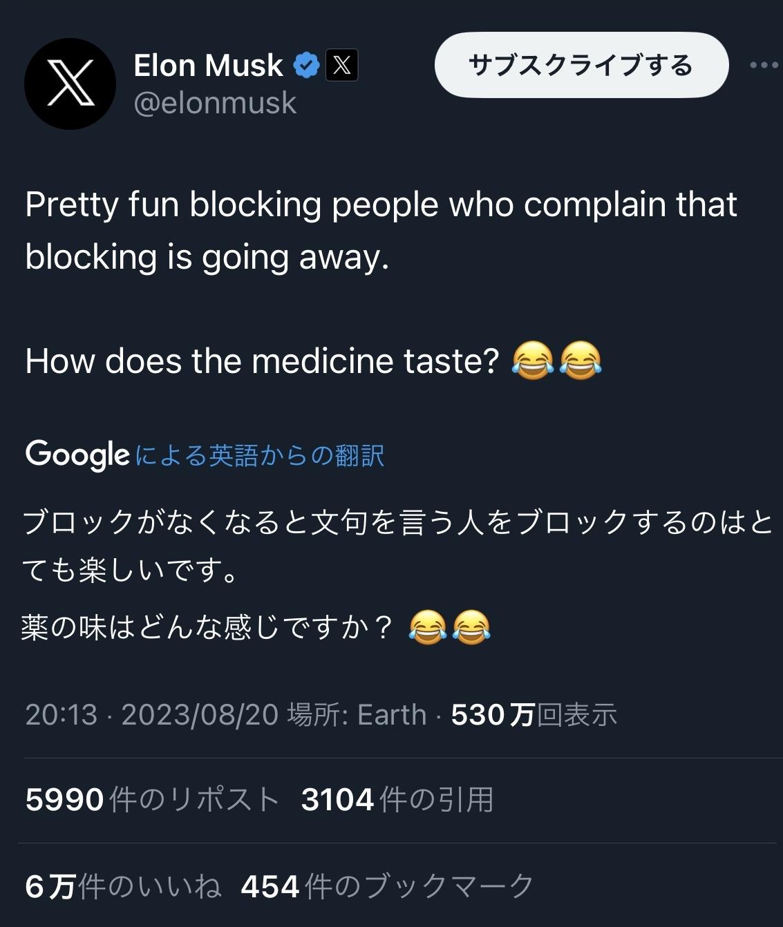 イーロンマスクさん「ブロック廃止に文句言う人をブロックするの楽しすぎ」