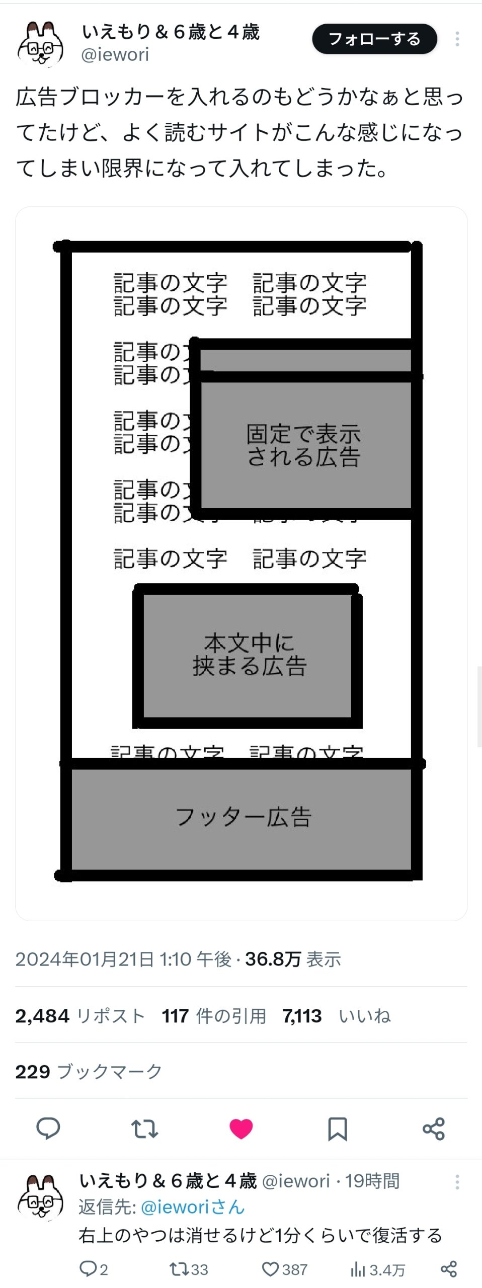 どこ触ったら元のコンテンツページ見れるか分からないようなもはや別ページになる広告あんなのやられて広告ブロックするなと言うほうが人間じゃねーよ