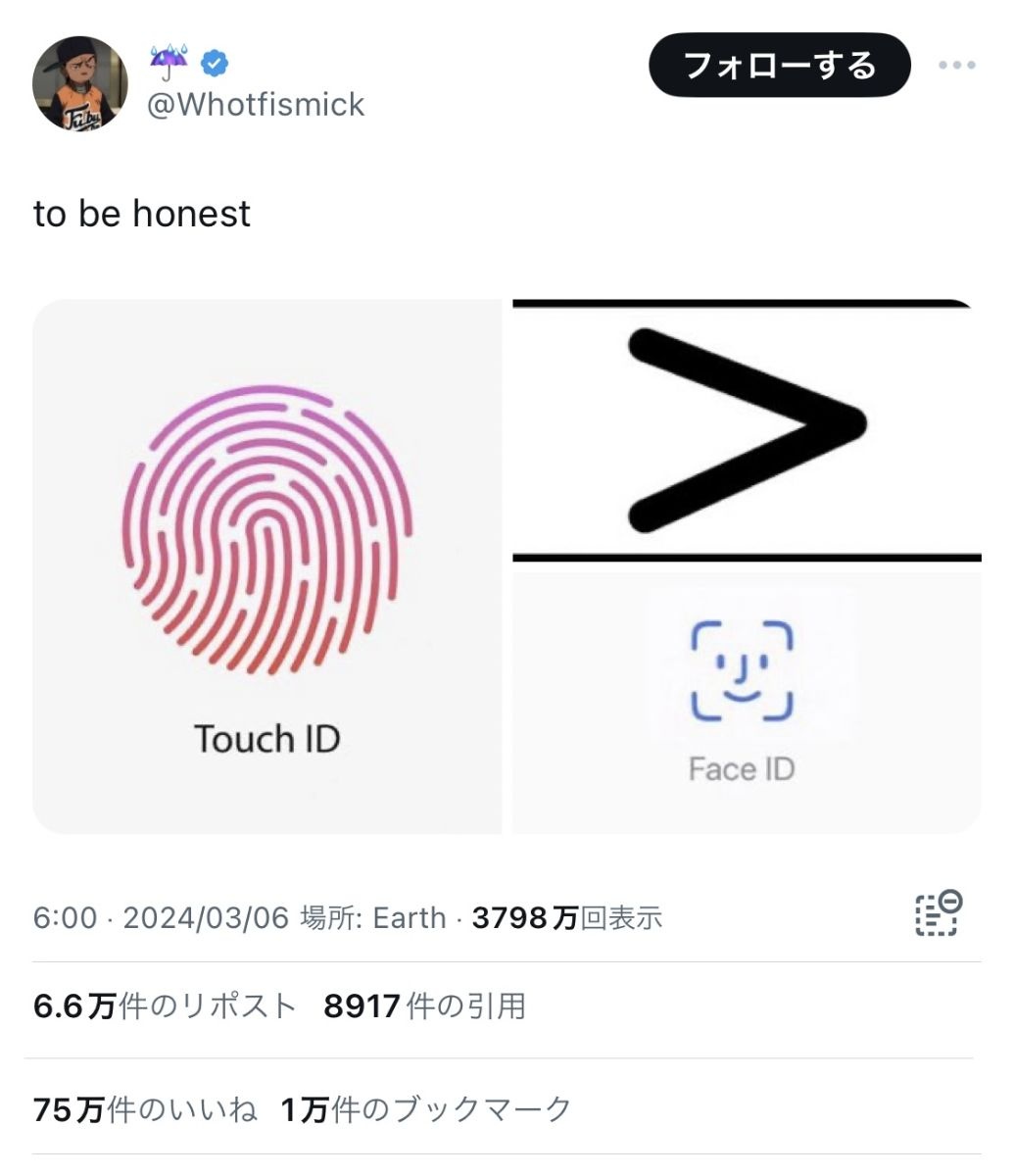 【画像】「iPhoneって正直、顔認証よりも指紋認証の方が良いよな」←脅威の75万いいねが集結www