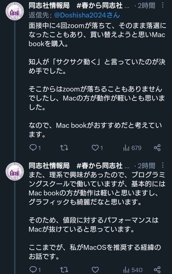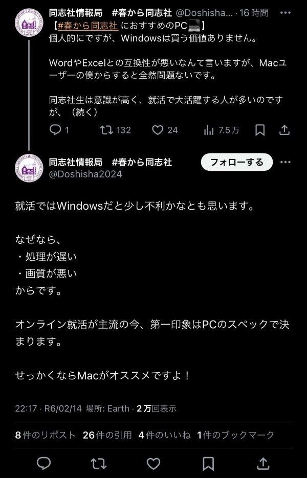 - 数年前に同じようにWindowsよりMacって旧Twitterでツイートしてた大学アカウントあったけどそれとは別なんやな