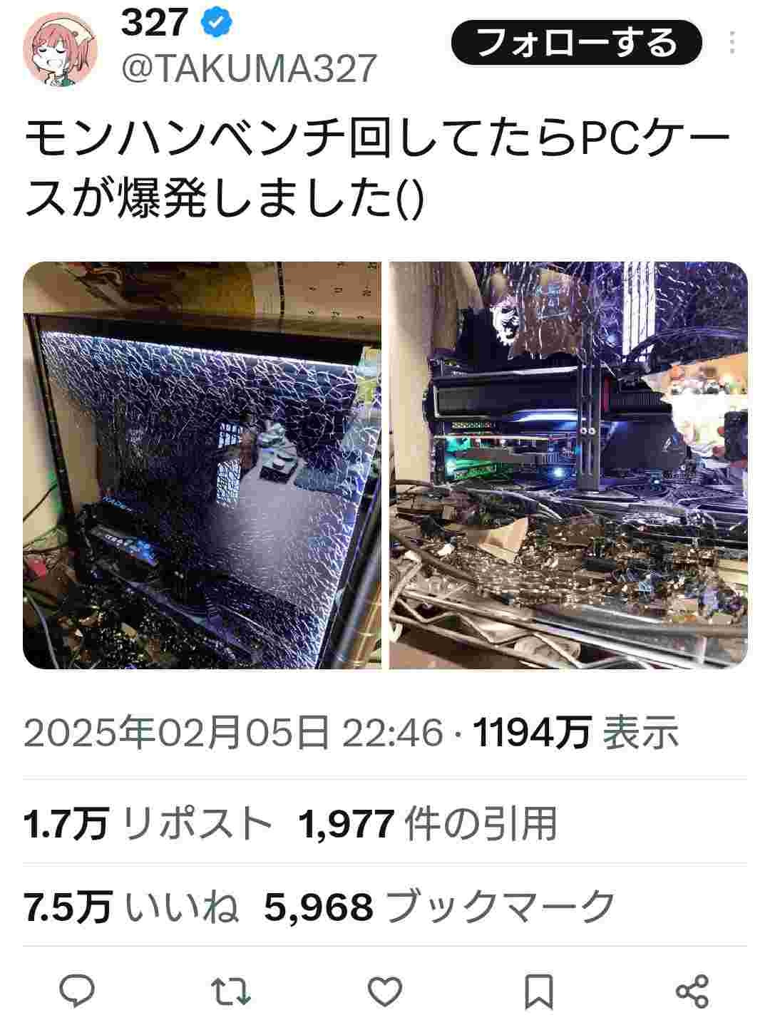 【画像】モンハンワイルズのベンチマークを回したPCユーザーさん、PCがとんでもない事になるwww