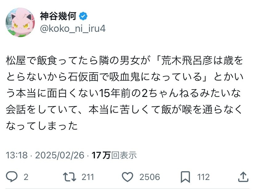 Twitter民「隣のカップルが荒木飛呂彦は吸血鬼という15年前のつまらない2chみたいな話をしていて、苦しくて飯が喉を通らなかった。」