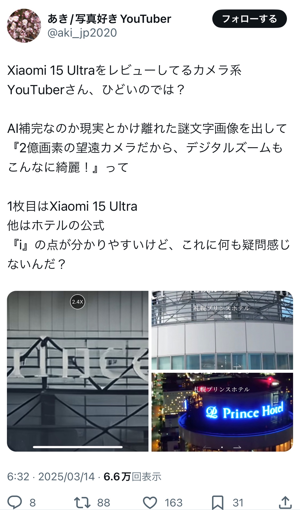 なるほど、ズームでぼやけた風景をカメラがAI補正して綺麗に見せてるだけじゃん!って憤慨してるって事か