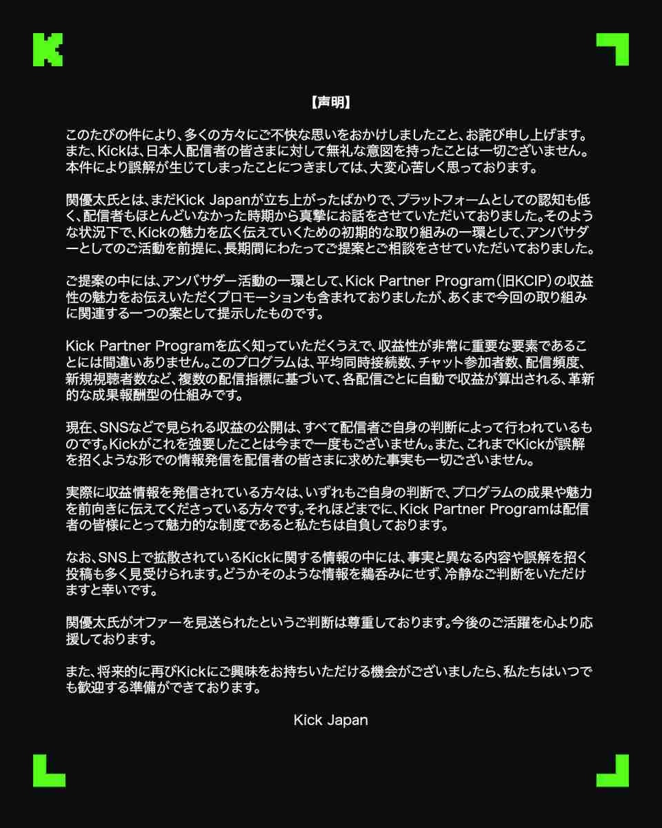 Kickは関優太氏に初期からアンバサダーとして協力を提案していたが、収益情報の公開は強制ではなく、すべて配信者の判断によるものと説明。誤解や不正確な情報が拡散されたことを遺憾に思い、関氏の判断を尊重しつつ将来的な関係継続にも前向きな姿勢を示した。