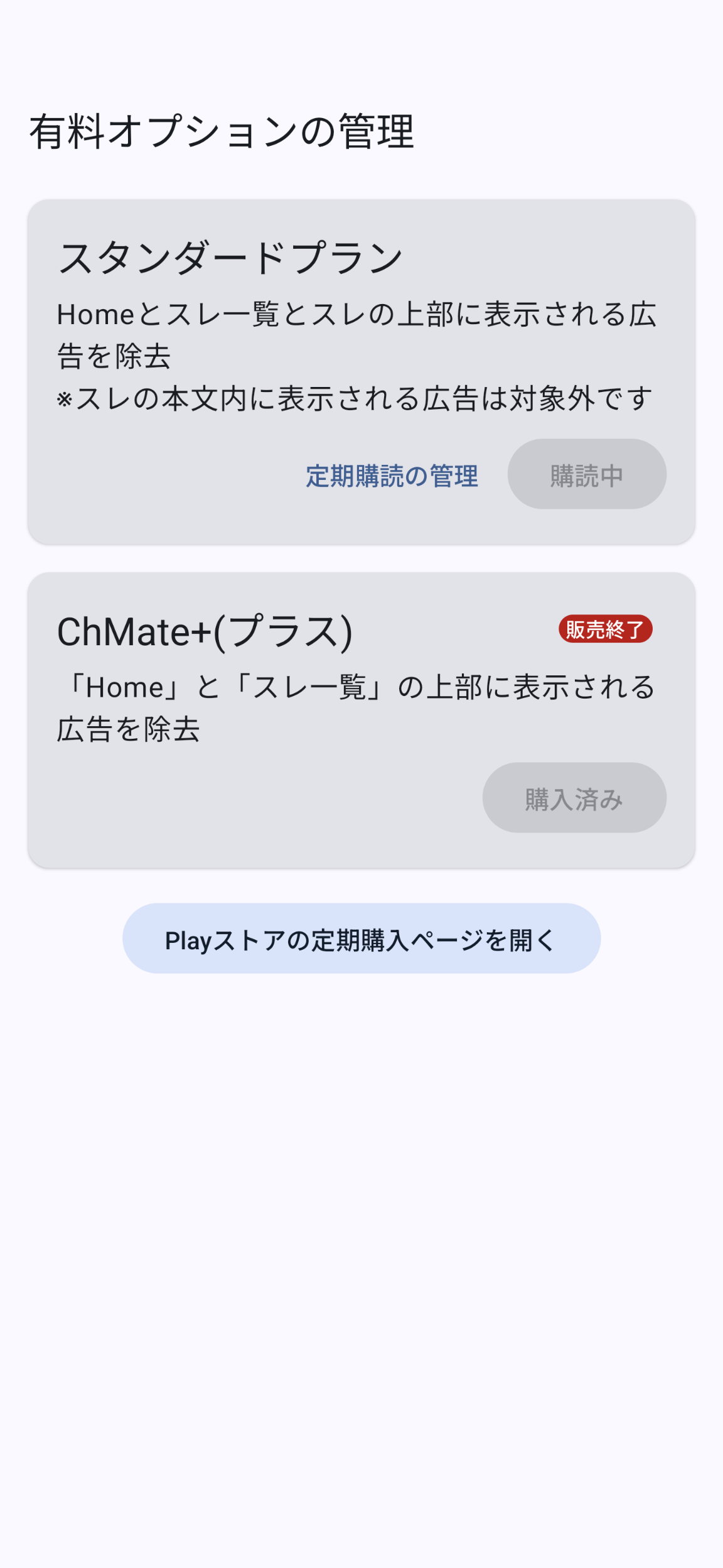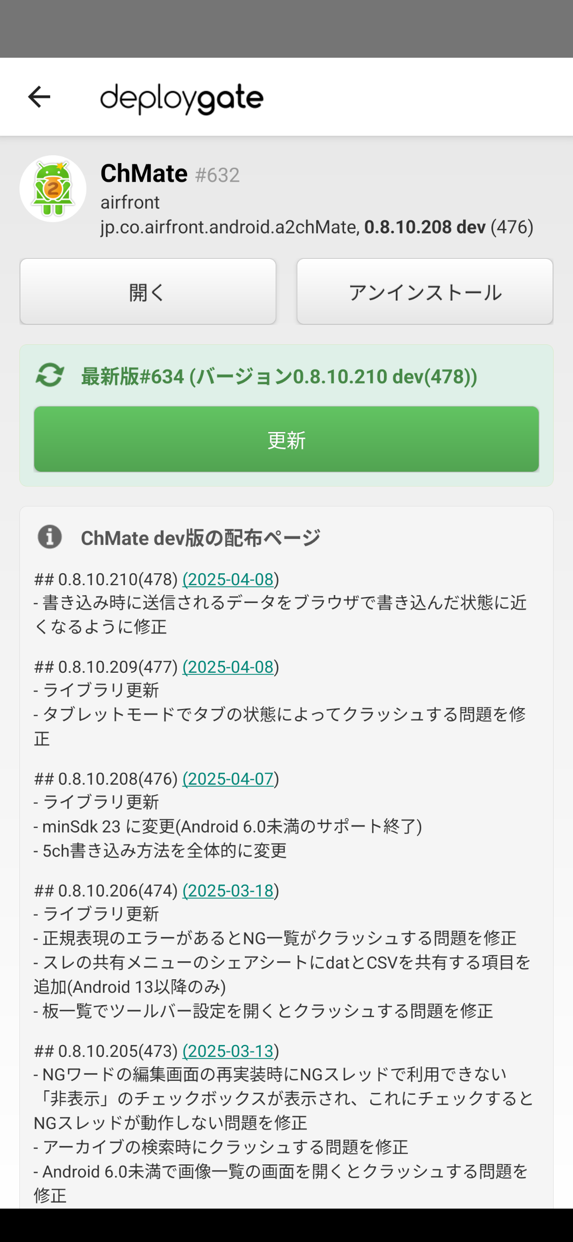 このサイト内のおすすめのページ # 最近の変更履歴 ChMateのdev版について よくある質問 データの保存場所について 外部リンク # ChMate – Google Play ChMate – DeployGate (dev版の配布ページ) お知らせ # 2023-06-14 試験的にPlayストアのオープンテストの機能で 0.8.10.162 を公開しました 2022-03-22 5chの仕様変更への移行スケジュールについて、2022年2月21日時点での情報では以下のようになっていました 書き込みできなくなる予定: 2022年3月22日 読み込みできなくなる予定: 2022年4月1日 もしも古いバージョンのChMateで読み書きができない場合は、ChMateを最新版にアップデートしてください 2022-03-15 Playストアで 0.8.10.153 を公開しました。(5chの仕様変更に対応) 2022-03-07 Playストアで 0.8.10.144 を公開しました 2022-02-28 2022年3月中に 5ch の仕様変更に対応したバージョンをリリース予定です。(0.8.10.141, 0.8.10.144 は対応していません) 将来的に古いバージョンの ChMate では 5ch の読み書きができなくなる予定です 2022-02-28 Playストアで 0.8.10.141 を公開しました 2021-12-29 Playストアで 0.8.10.138 を公開しました 2021-12-24 Play ストアで 0.8.10.135 を公開しました 2021-12-22 Play ストアで 0.8.10.132 を公開しました 2021-12-21 Play ストアで 0.