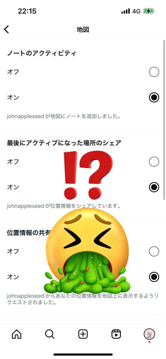�CInstagramで地図情報をONにしている(👈今回勝手にONになった)この全てを満たしていると位置情報が共有される