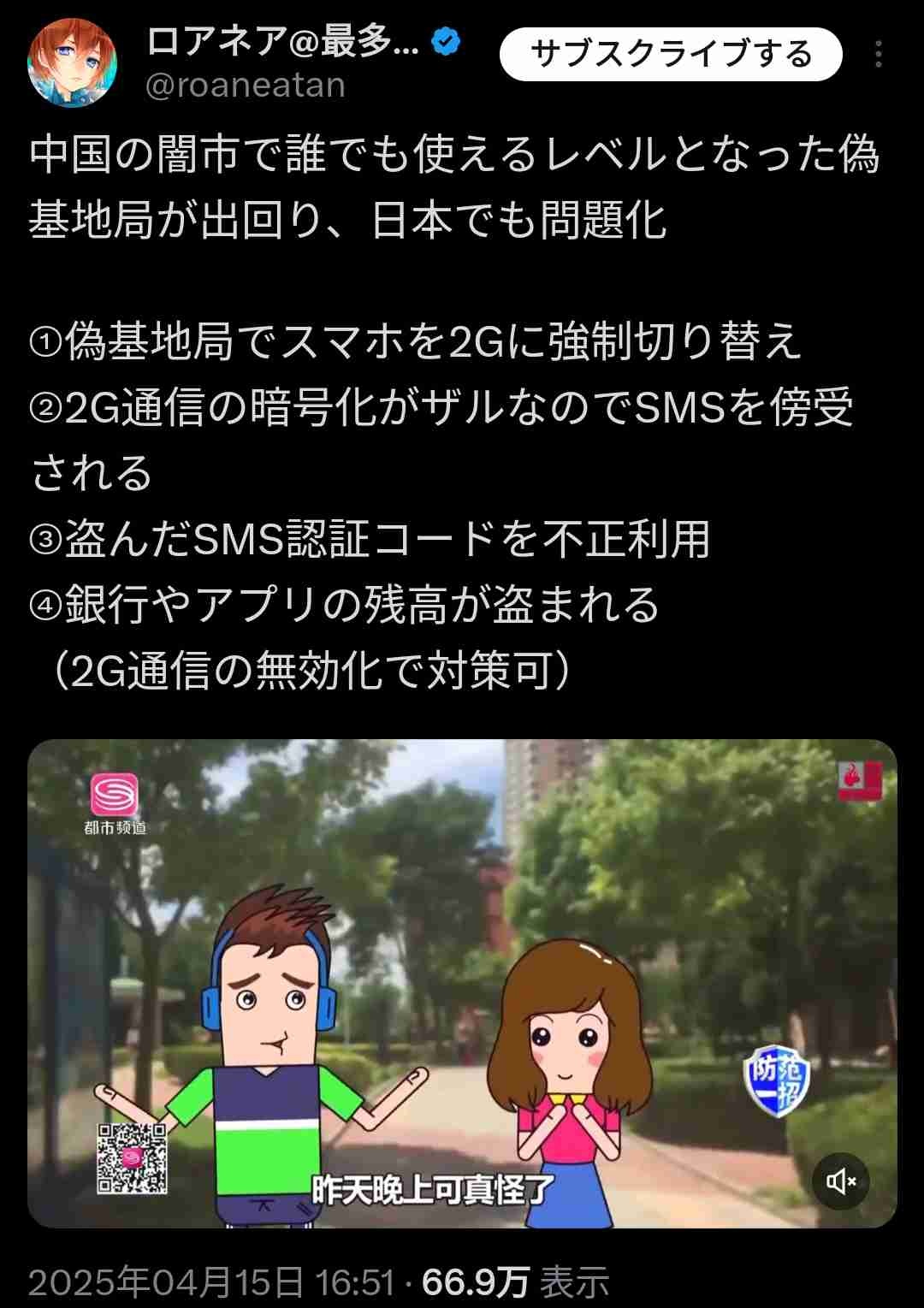 【注意喚起】車に強力なアンテナを積んで周囲のスマホを強制的に2G回線にし、SMSを悪用する電波テロが発生中