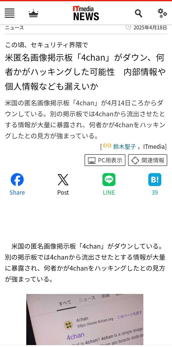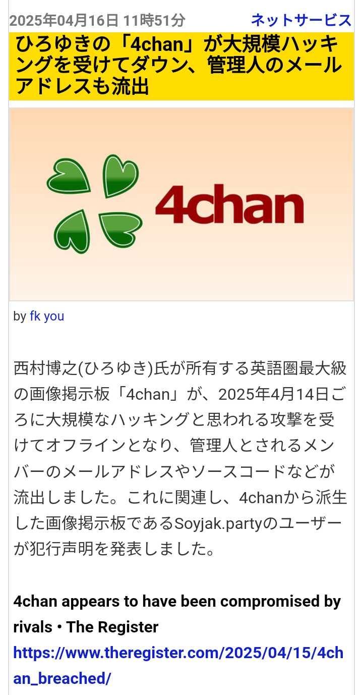 4chanを乗っ取られる(2025) - 2 : 2025/04/19(土) 00:33:52.947 ID:1i1hUtkjW