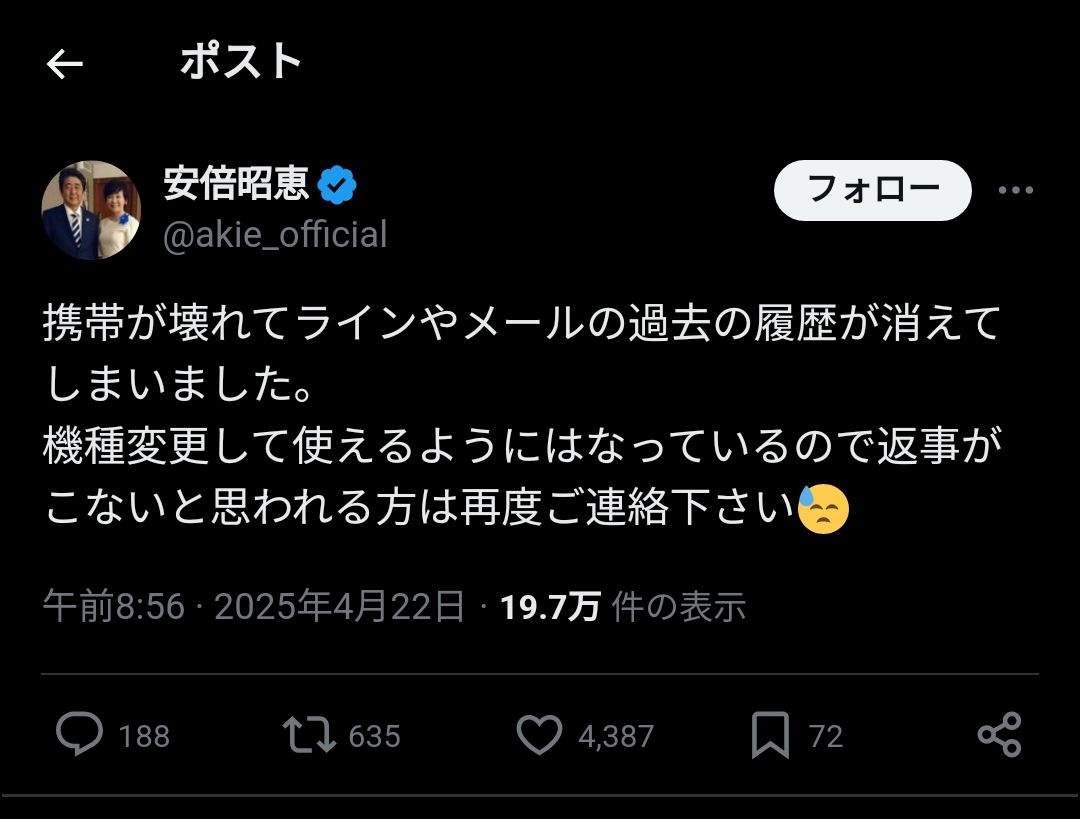 安倍昭恵さん、スマホが壊れてメールやラインの履歴が全て消える