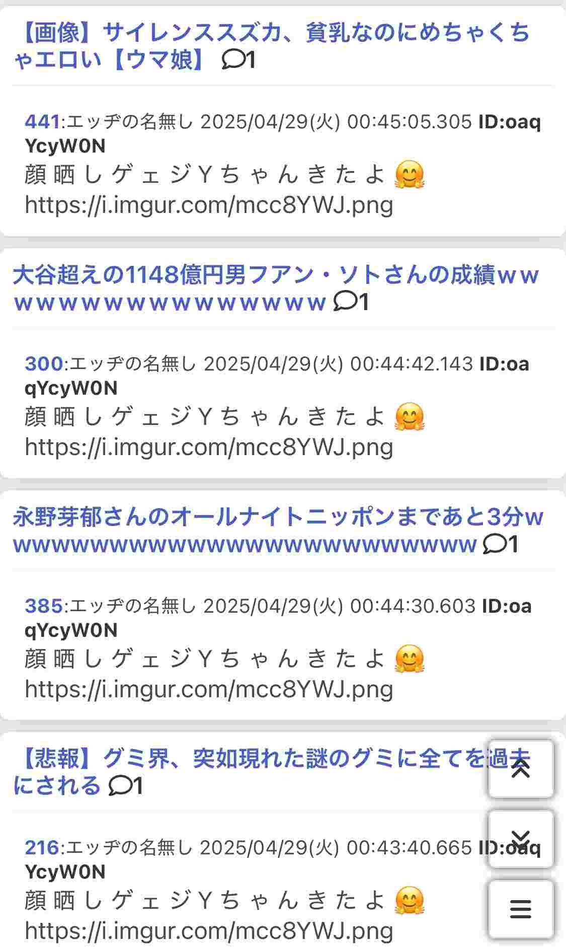 こいつに関しては正規表現で弾くか1日1回NGぶち込むしかなさそう - 55 : 2025/04/29(火) 03:45:37.285 ID:1vsHpxRJt