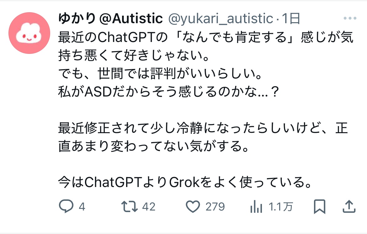 ツイッタラー「最近のChatGPTの『なんでも肯定する』のが気持ち悪くて好きじゃない。Grokの方がいい」