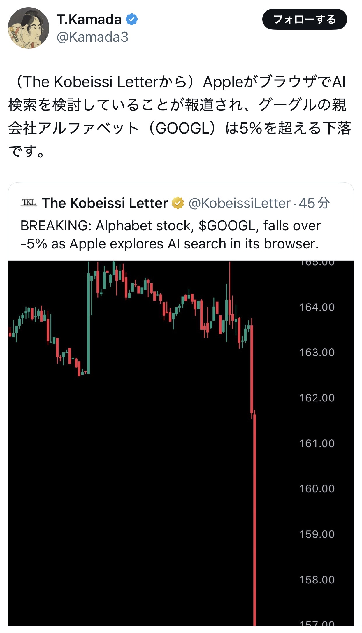【ザマァw】グーグル株、一瞬でマイナス7.41%もの大☆暴☆落wwwアップルがブラウザでAI検索を検討中と報じられるwww