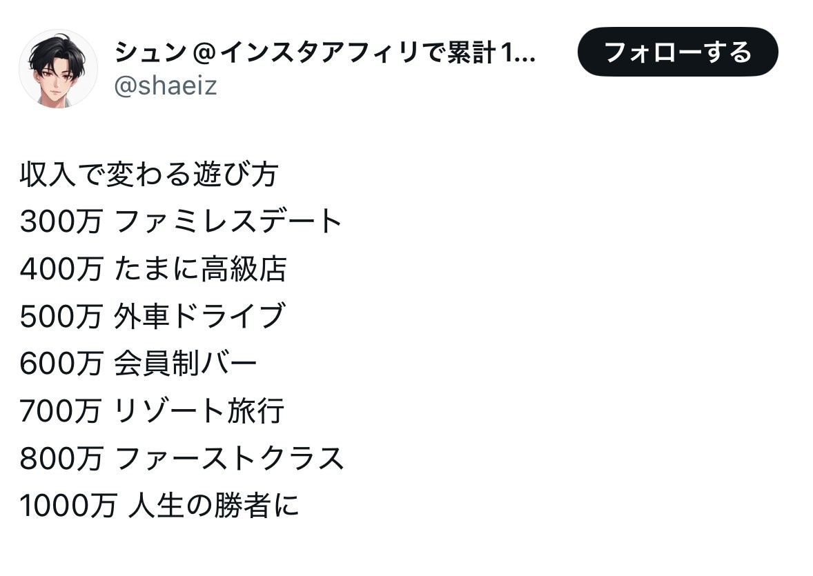 ツイッター民「年収によって遊び方はこれだけ変わる」