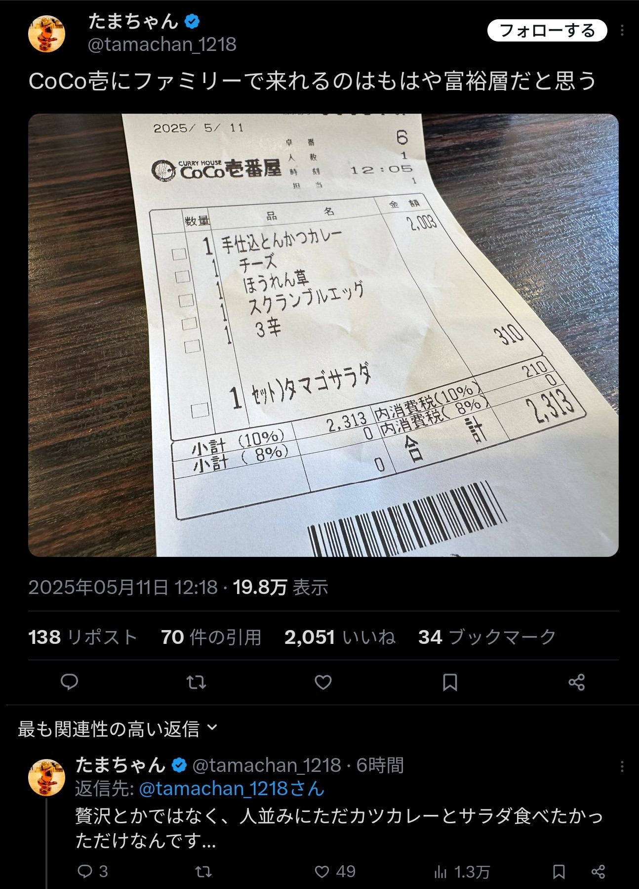 X民「ココイチのカツカレーとサラダ、お会計2,300円。異常だよ」
