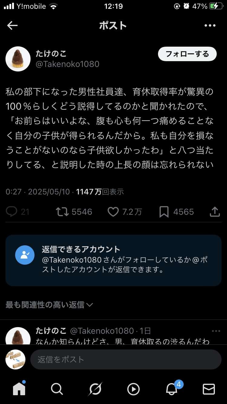 - 私の部下になった男性社員達の育休取得率が驚異の100%な件についてどう説得してるのかと聞かれたので「腹も心も何一つ痛めることなく自分の子供が得られるんだからお前らはいいよな。私も自分を損なうことがないのなら子供欲しかったわ」と八つ当たりしていると説明した時の上長の顔は忘れられない