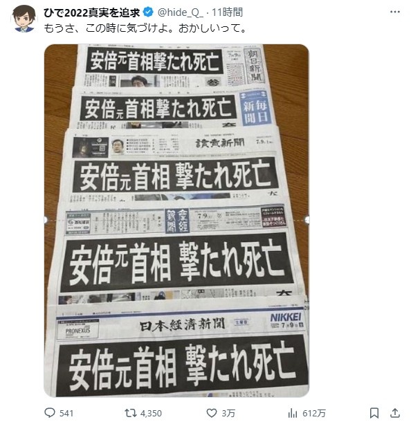 - 見出しが全部一緒だからメディアは元々知ってて全部仕組まれたもの、マスコミとつるんだ勢力に殺されたんだ、みたいな陰謀論やろ