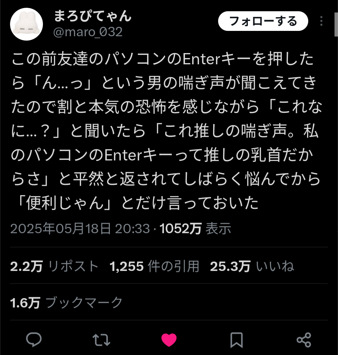 【ライフハック】「まずEnterキーを推しの乳首だと想定し、キーボードを打つ度に喘ぎ声が出るようにしました」25万いいね👍