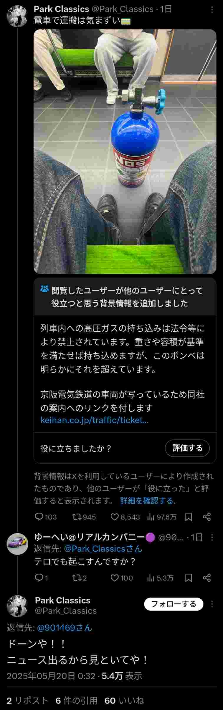 シビックいじりが趣味の陽キャ、電車に高圧ガスボンベを持ち込みツイッターでテロ予告してしまう