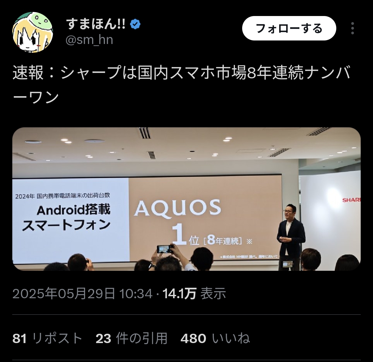 - 聞いたことない中華や韓国メーカーのスマホは買いたくないとなるとシャープ1択