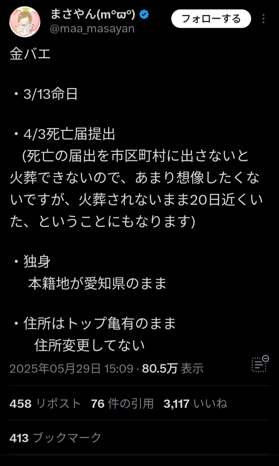 死んだ日であろう日以降に金バエと名乗る奴から金の無心の連絡があって振り込んだやつがいるらしいが