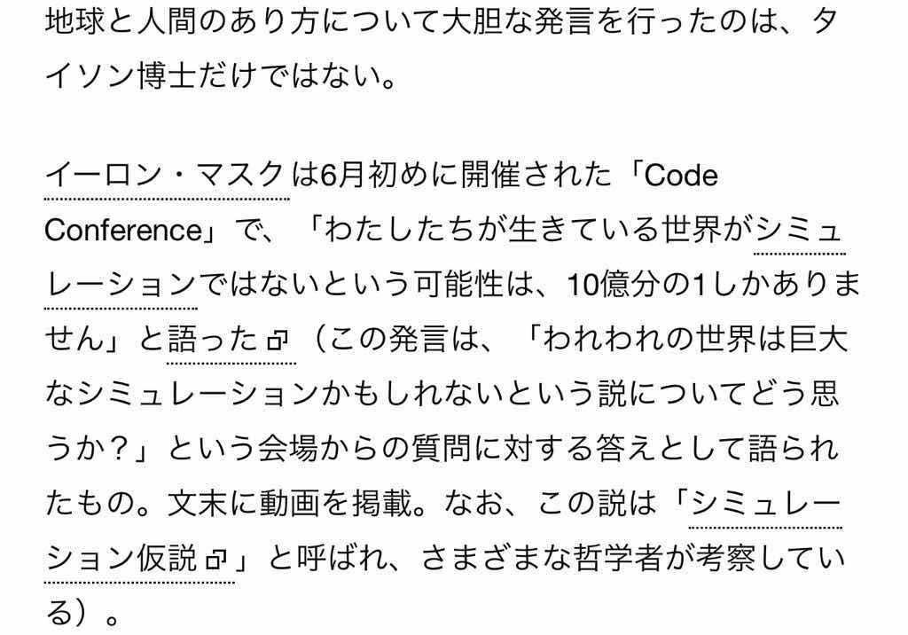 という会場からの質問に対する答えとして語られたもの。https://gigazine.net/news/20160816-elon-musk-living-simulation/#google_vignette