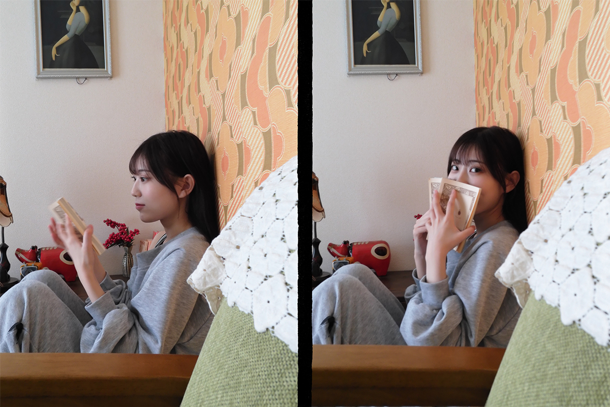 もうひとつ、「X half」ならではの楽しみといえるのが「2-in-1」機能です。通常モードで1枚撮影し、フレーム切り替えレバーを引いてからもう1枚撮ると、縦構図の写真を左右に並べた1枚として記録されます。以前この連載で紹介した「PENTAX 17」のように、いわゆる“ハーフカメラ”的な遊び方ができるわけです。