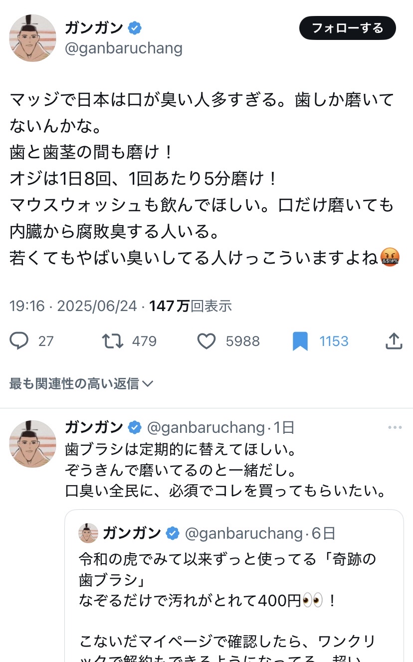X民「日本人は口が臭い人多すぎる!ちゃんと歯磨け、フロスしろ、マウスウォッシュもちゃんと飲め」