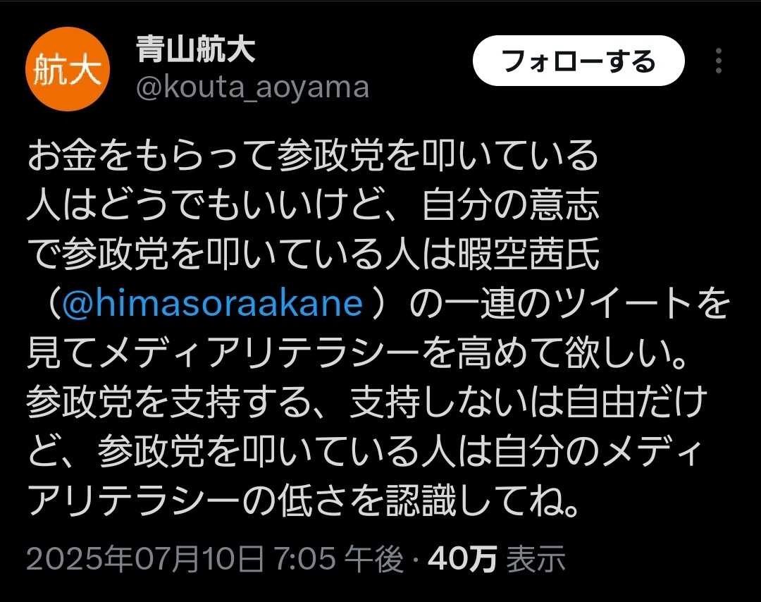 【正論】参政党支持者「参政党を叩いてる人は暇空茜氏のツイートを見てメディアリテラシーを高めて欲しい😤」