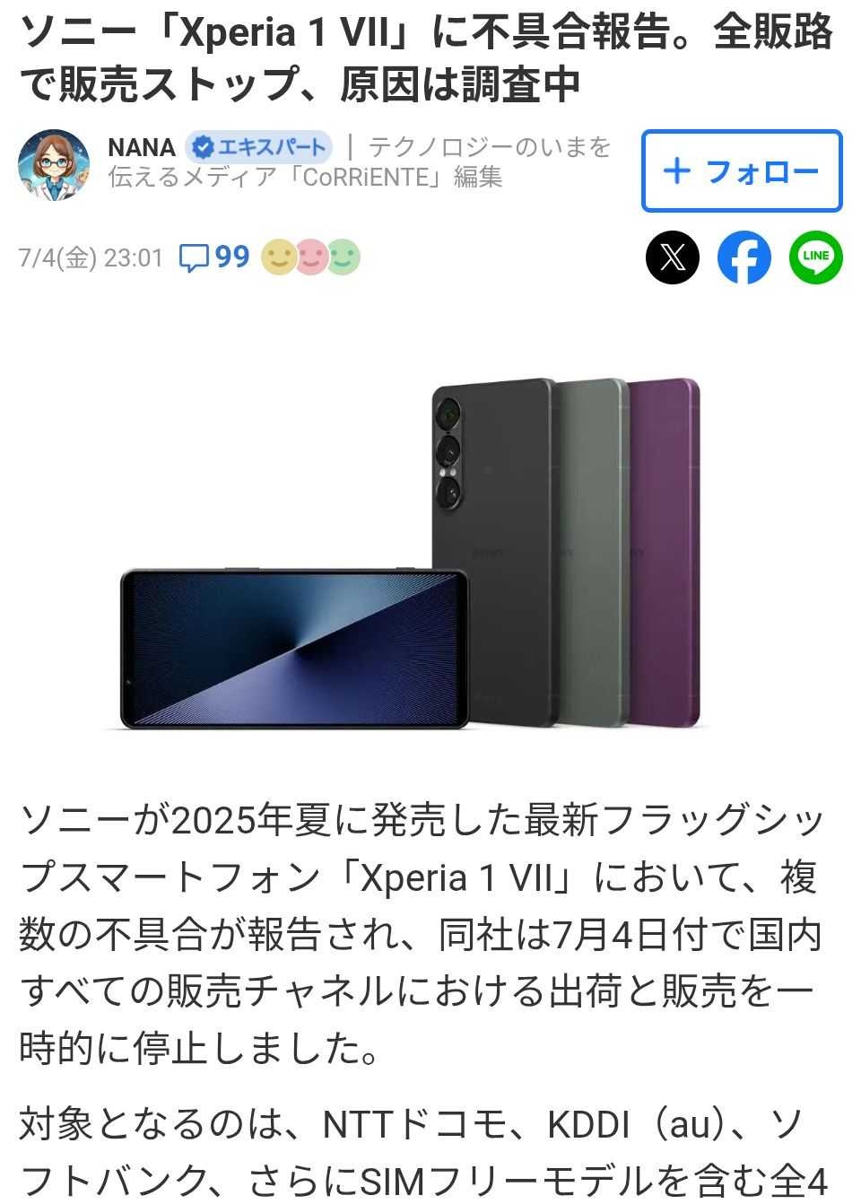 ソニーの自信作「Xperia 1 VII」さん、ゴミすぎて販売中止www購入者への補填無し