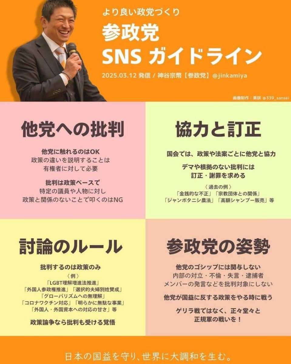 参政党「選挙中に殺害予告とかしちゃうバカ、とりあえずこのSNSガイドライン読め」10万いいね