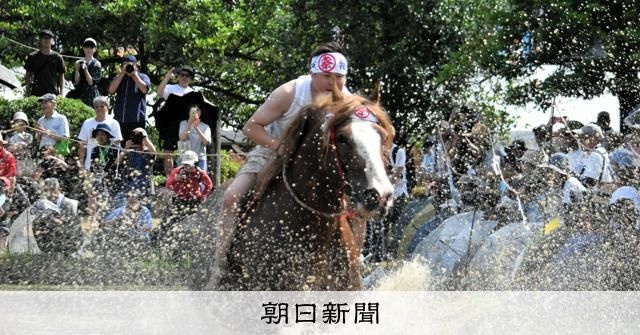 祭りの華は2日目の「牛馬(ぎゅうば)入れ」。町役場近くの「神田」に2頭の「神馬」が乗り入れ、背に男衆を乗せて泥田を駆け回り、周囲の観客に泥を浴びせかけた。