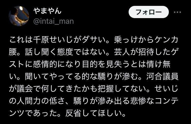 - 態度デカいガサツキャラでやってきて芸能界での地位もそこそこあるから「さすがせいじさん!辛口で鋭い!おもろいっす!」で自分の意見通るのが当たり前だった分ガチバトルになってどうしていいか分からずなんとか負けてない風の笑顔繕いながら子供みたいな人格否定絞り出すしか出来なかったのが手に取るように分かる