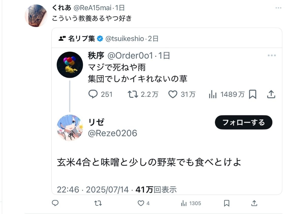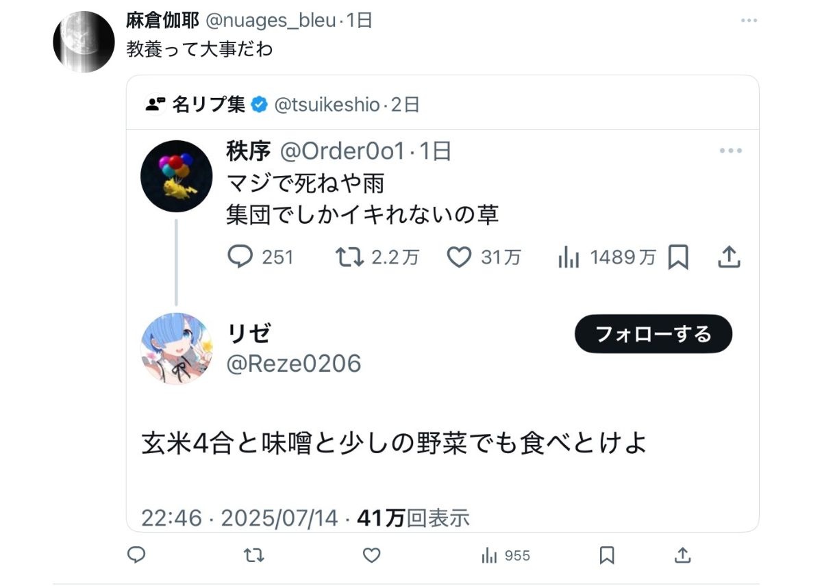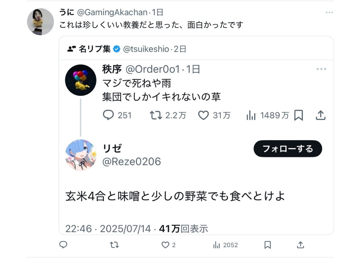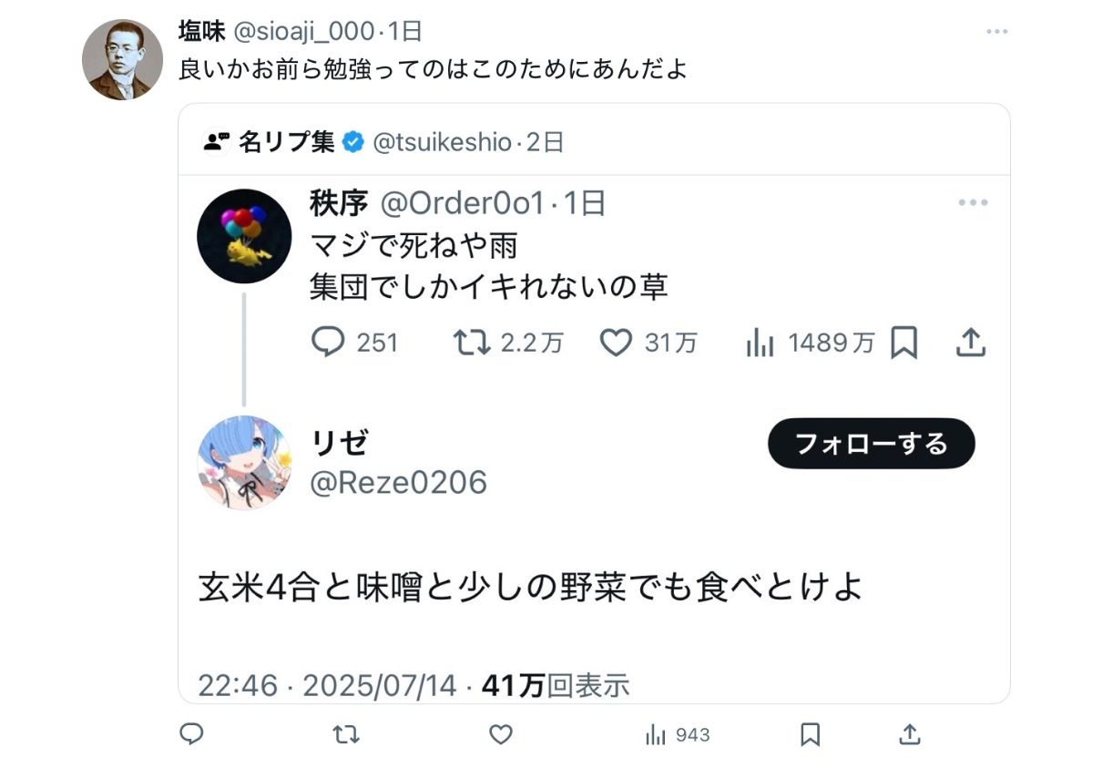 教養無いからなんでこのツイートに対して雨ニモマケズの一節をつかって返信したのか意味がわからない - 47 : 2025/07/19(土) 17:53:09.491 ID:ODf/t4Dq0