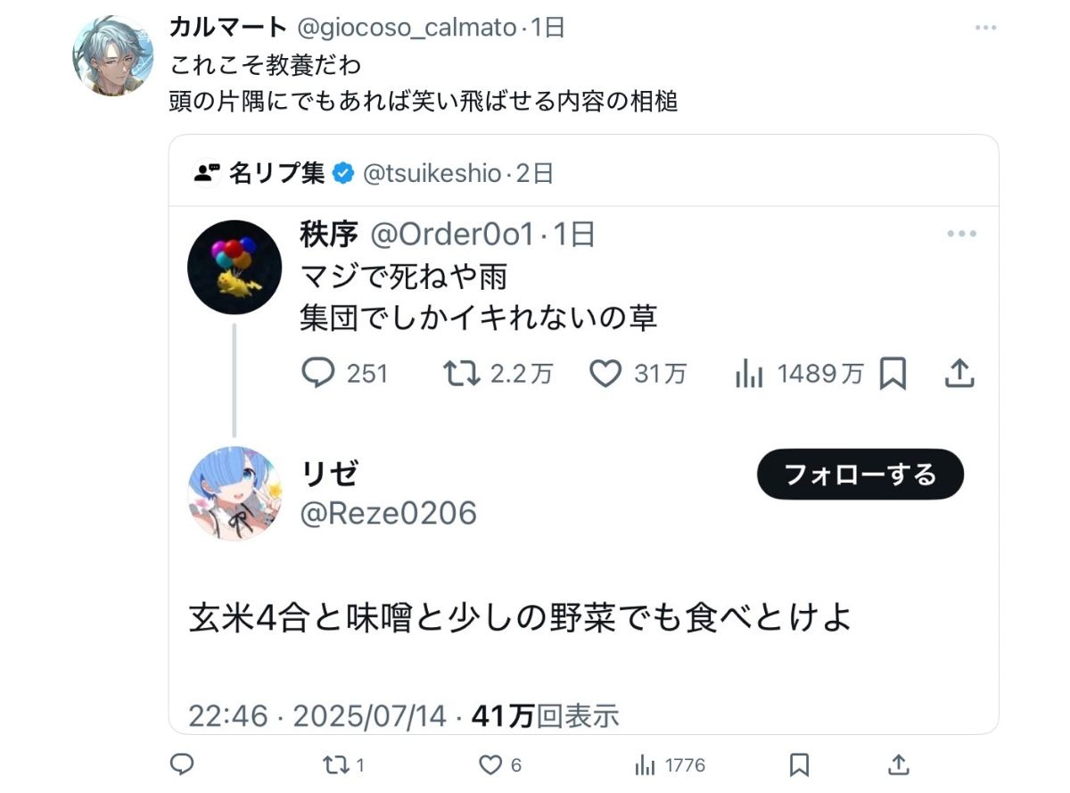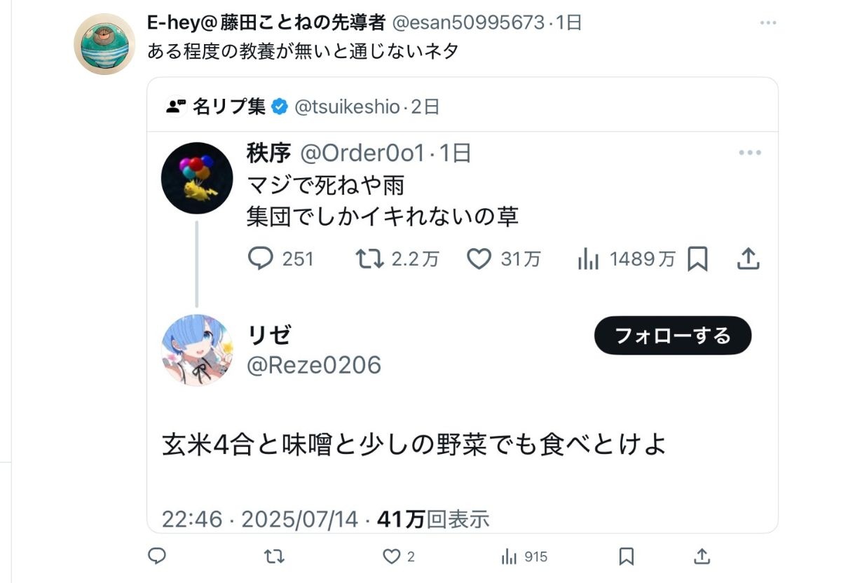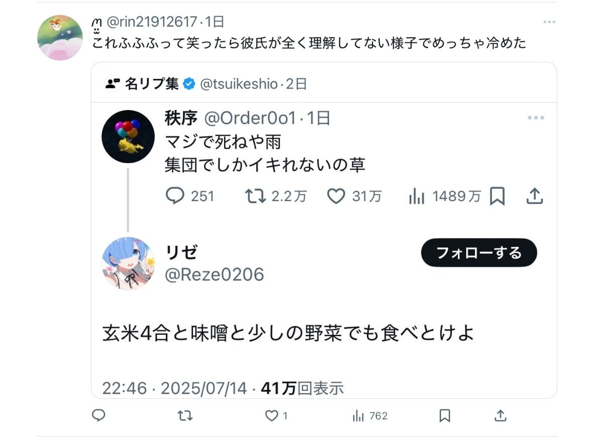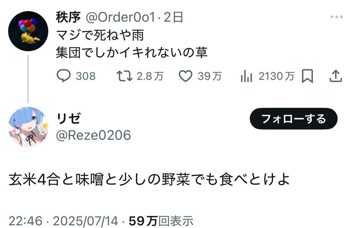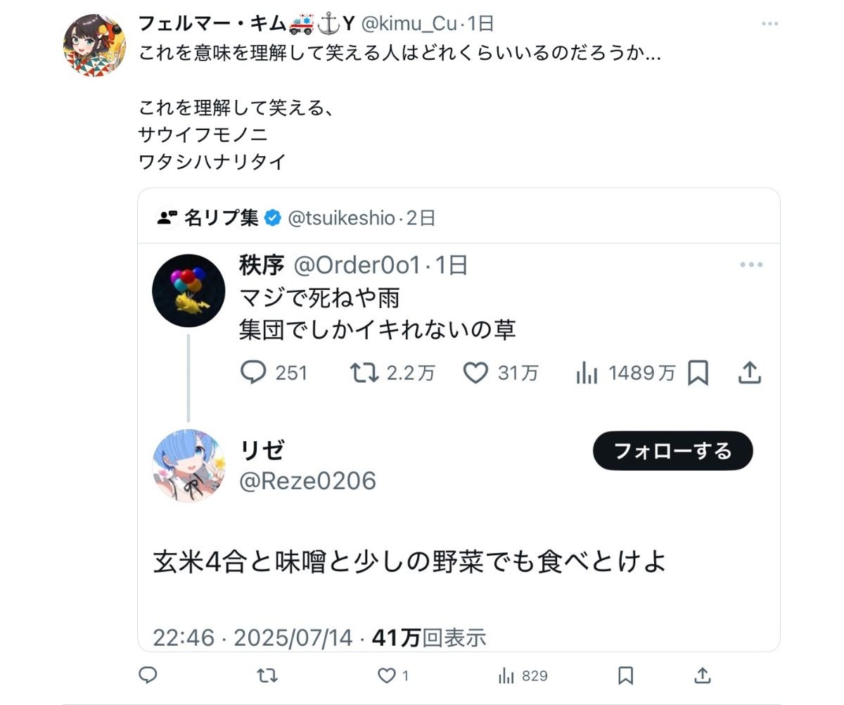 教養無いからなんでこのツイートに対して雨ニモマケズの一節をつかって返信したのか意味がわからない - 47 : 2025/07/19(土) 17:53:09.491 ID:ODf/t4Dq0