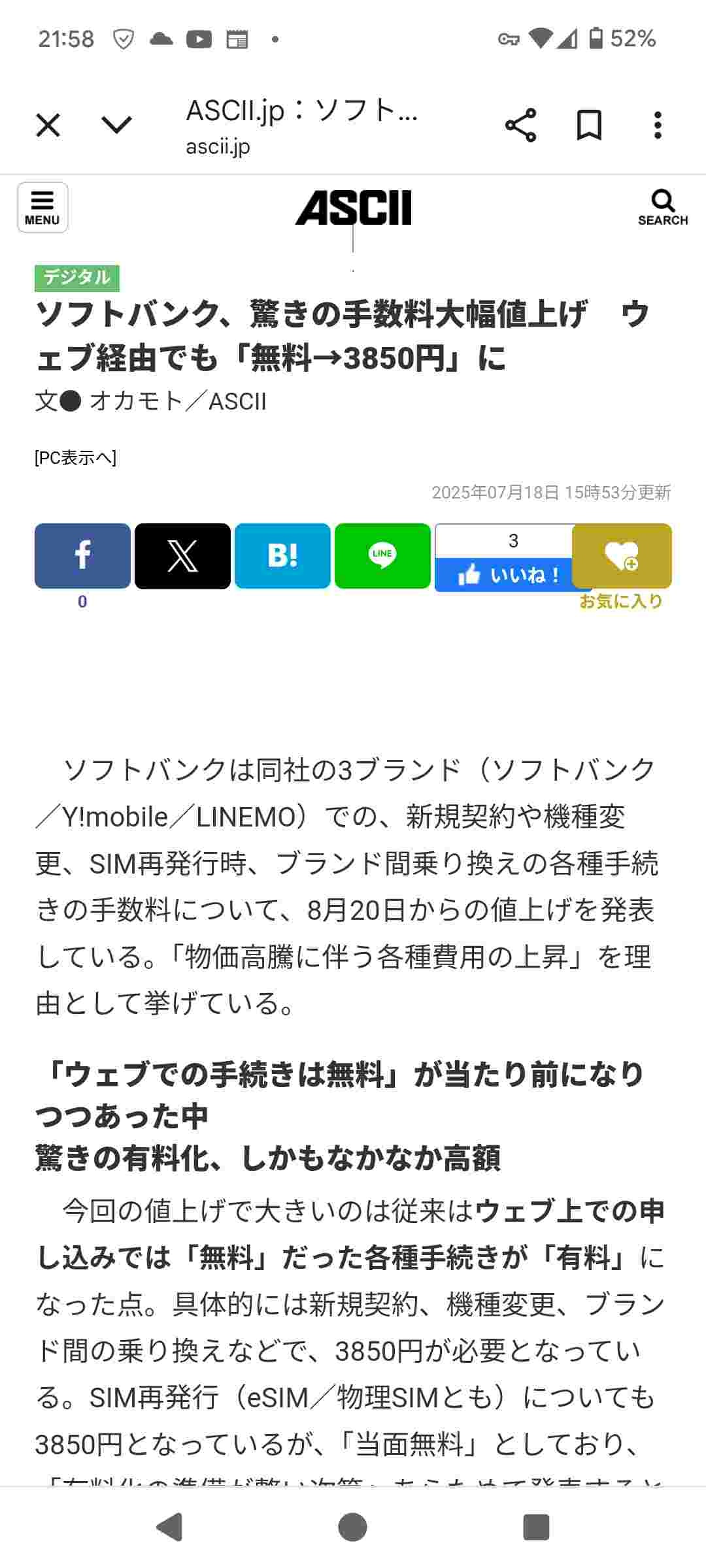 ソフトバンク、驚きの手数料大幅値上げ ウェブ経由でも「無料→3850円」にソフトバンクは同社の3ブランド(ソフトバンク/Y!mobile/LINEMO)での各種手続きの手数料について、8月20日からの値上げを発表している。驚きはウェブ上での申し込みでは「無料」だった各種手続きが「有料」、しかも3850円になった点だ。ascii.jp- 37 : 2025/07/19(土) 22:00:09.04 ID:SNMMuCQi0