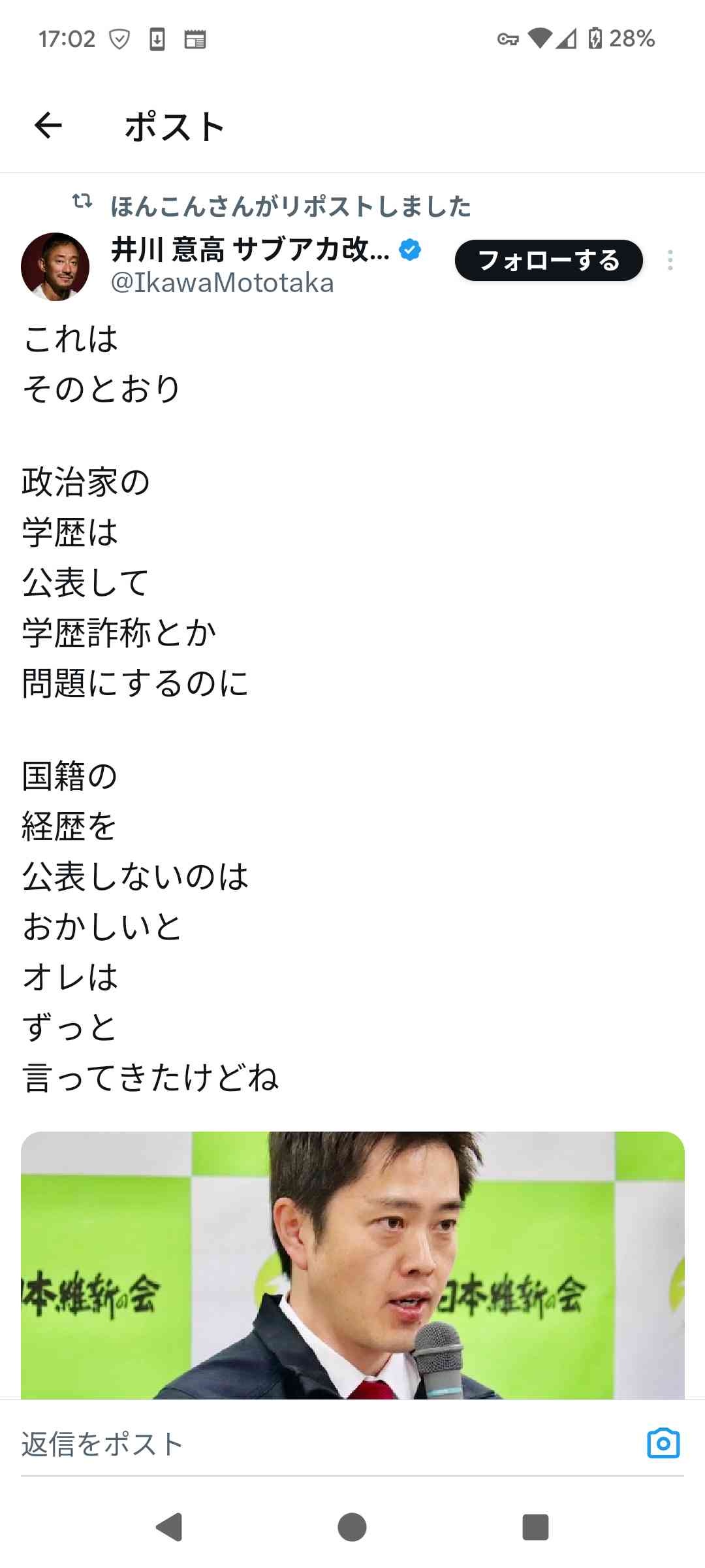 ほんこん さん「政治家の学歴は公表して学歴詐称とか問題にするのに、国籍の経歴を公表しないのはおかしい」リツイートする