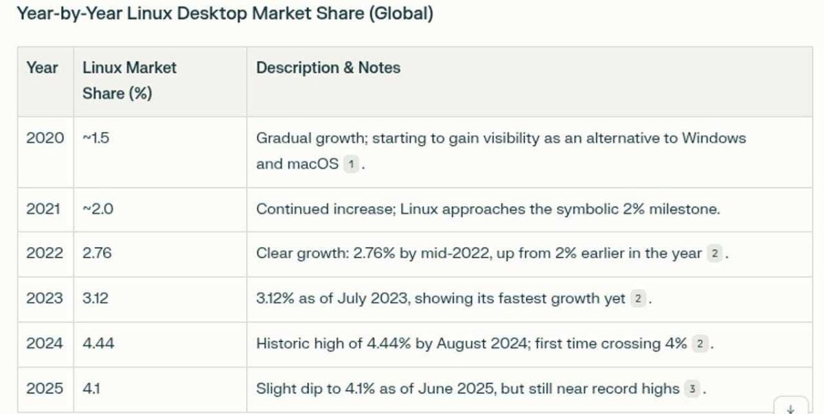 ここ数年、Linuxデスクトップのシェアは着実に上昇しており、その成長速度は加速している。StatCounterの数字によれば、2020年にはLinuxデスクトップの市場シェアは約1.5%に過ぎなかったが、2021年には2%、2022年には2.76%、2023年には3.12%という新記録を達成し、2024年には4%を超えた。世界市場ではまだ5%には達していないものの、依然として4%を大きく上回っている。
