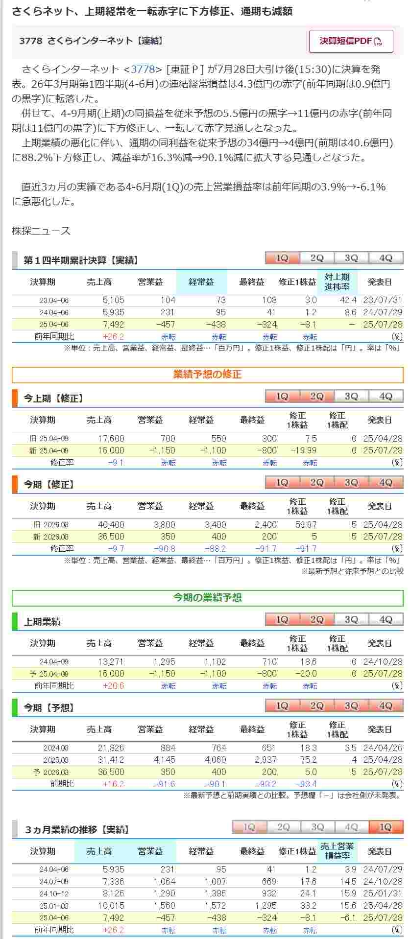 国策クラウドとして経産省から補助金を受けていたさくらインターネット、上期経常を一転-88%に下方修正でPTS阿鼻叫喚