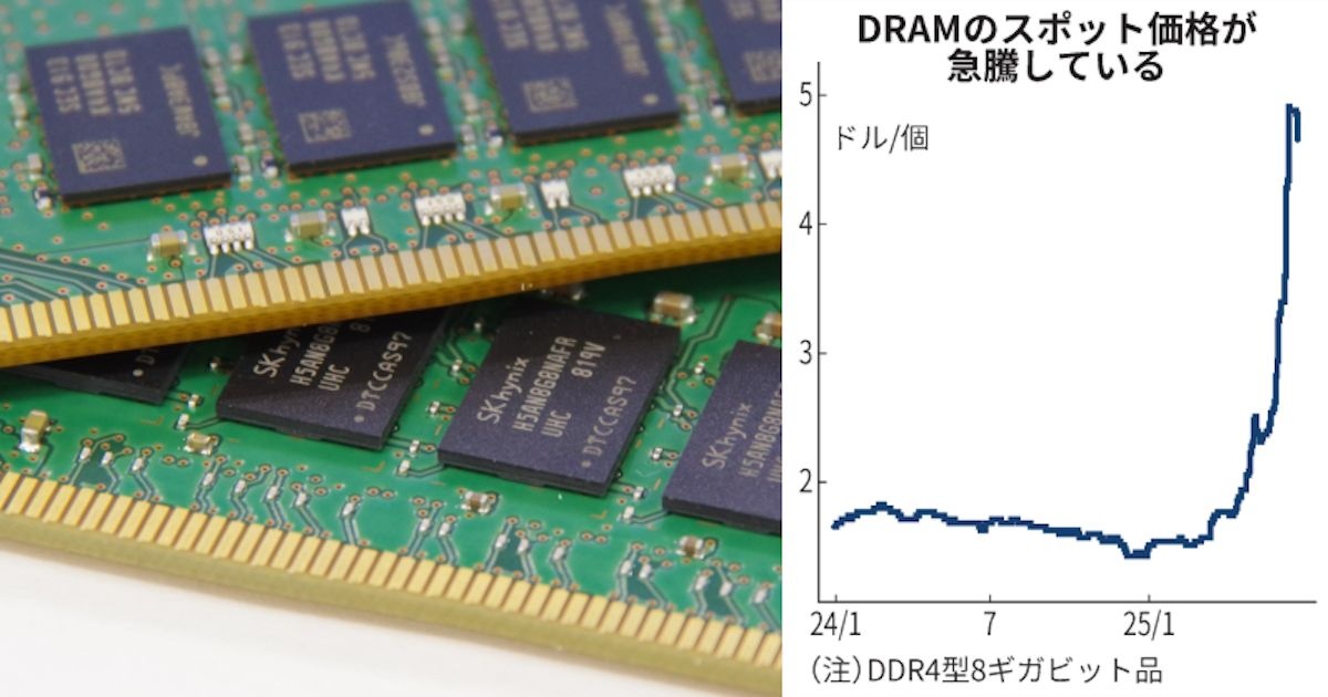 半導体メモリー、DRAMのスポット(随時契約)価格が急騰している。指標となるDDR4型の8ギガ(ギガは10億)ビット品は1カ月で2倍になった。中国のDRAM大手、長鑫存儲技術(CXMT)がDDR4型の生産を段階的に終了するとの見方が出て今後の需給引き締まりの観測が広がった。大口取引価格を押し上げる可能性がある。