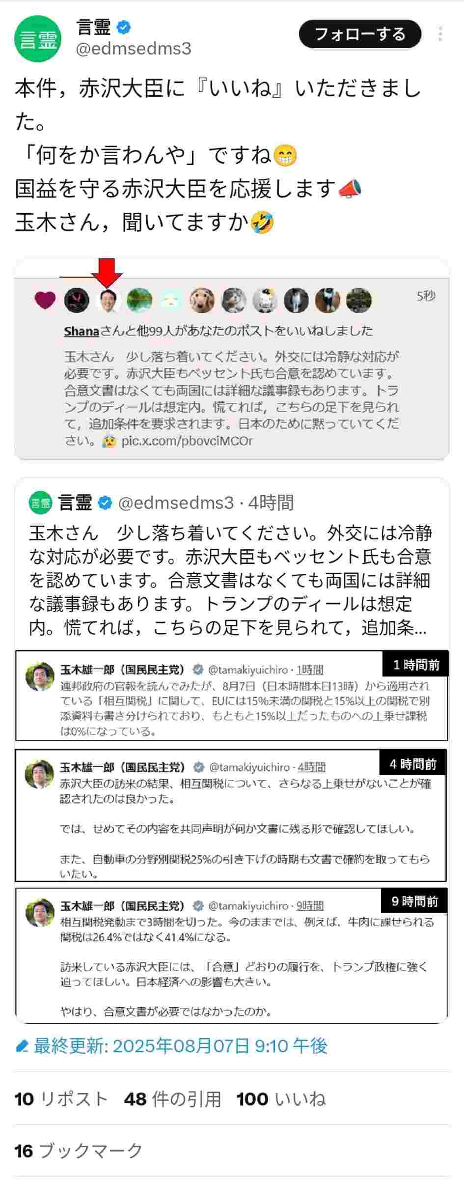 - いや、赤沢は一昨日前にEUと同じになると認識していると答弁してたのに玉木が指摘してる通りになってる時点でこのいいねはダサいわ。