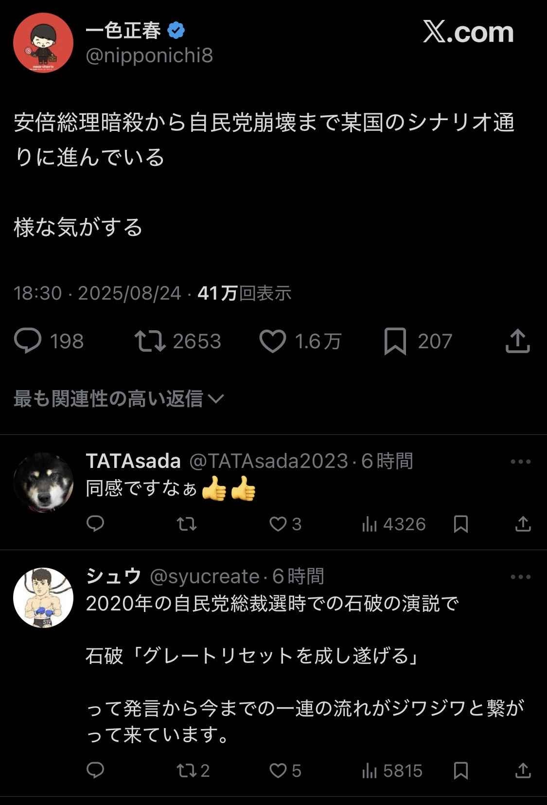 Twitter有識者「安倍総理暗殺から自民党崩壊まで某国のシナリオ通りに進んでいる」👈某国ってどこなん?