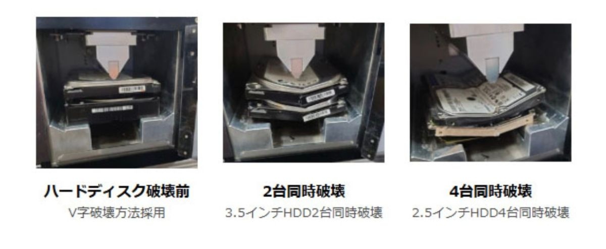 2.5/3.5インチHDDと2.5インチSSDでは破壊方法が異なる。HDDでは油圧式の杭によって外殻ごとプラッタを折り、SSDの場合は確実にフラッシュメモリを破壊できるよう、複数の刃を並べたユニットで上下から挟み込んで破壊する。HDDは1回の動作で2.5インチなら4台まで、3.5インチなら2台まで同時に破壊可能。M.2 SSD、USBメモリ、SDカード、スマートフォン(バッテリの取り外しが必要)にも対応している。