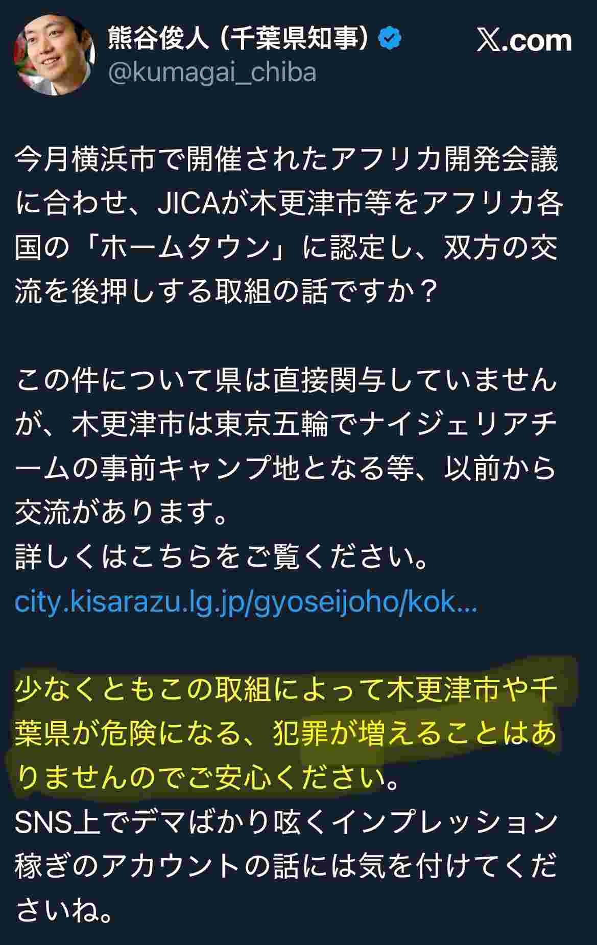 熊谷俊人千葉県知事、ナイジェリア騒動で「SNS規制必要」発言にX上で批判殺到(1/2ページ)千葉県の熊谷俊人知事が28日、定例会見でナイジェリアなどアフリカ諸国のホームタウン認定をめぐる誤情報拡散騒動について、SNSへの規制の必要性に言及。この発言に…www.zakzak.co.jp- 2 : 2025/08/28(木) 19:11:43.00 ID:PineKLfa0